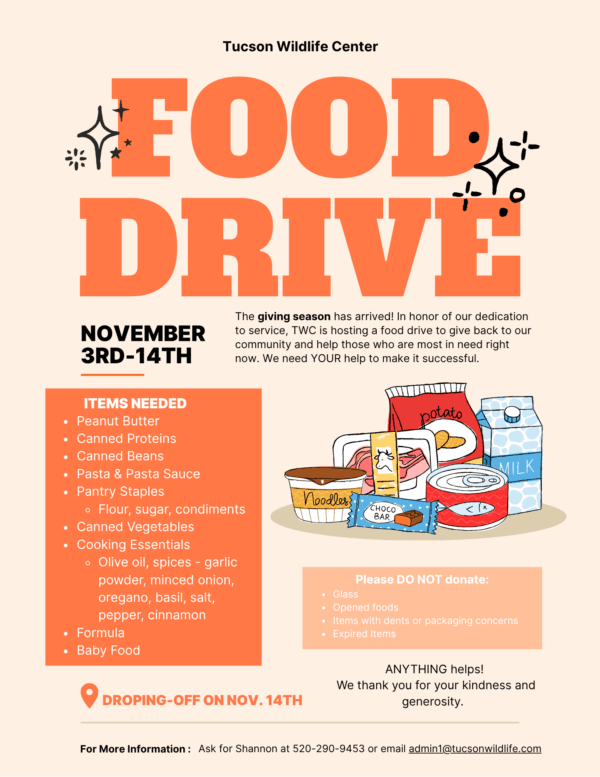 We are dedicated to the rescue, emergency medical care and rehabilitation of Southern Arizona’s sick, injured, and orphaned wildlife before return to the wild.