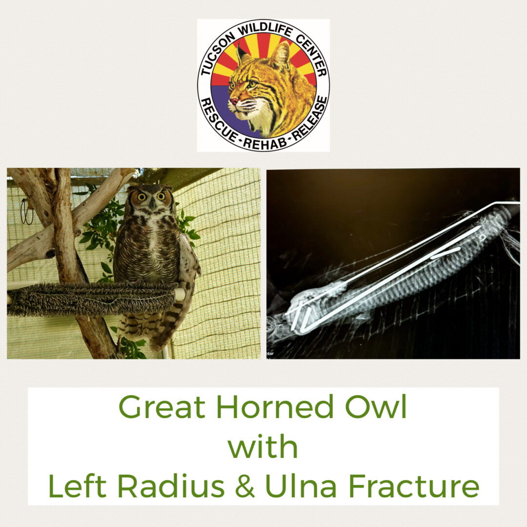 Tucson Wildlife Center’s rescue team recently responded to three separate Great Horned Owl rescues. In each case, the owl was found near a roadway after an apparent collision with a moving vehicle. All three birds suffered a combination of head and eye trauma, and varying degrees of fractures from the impact.