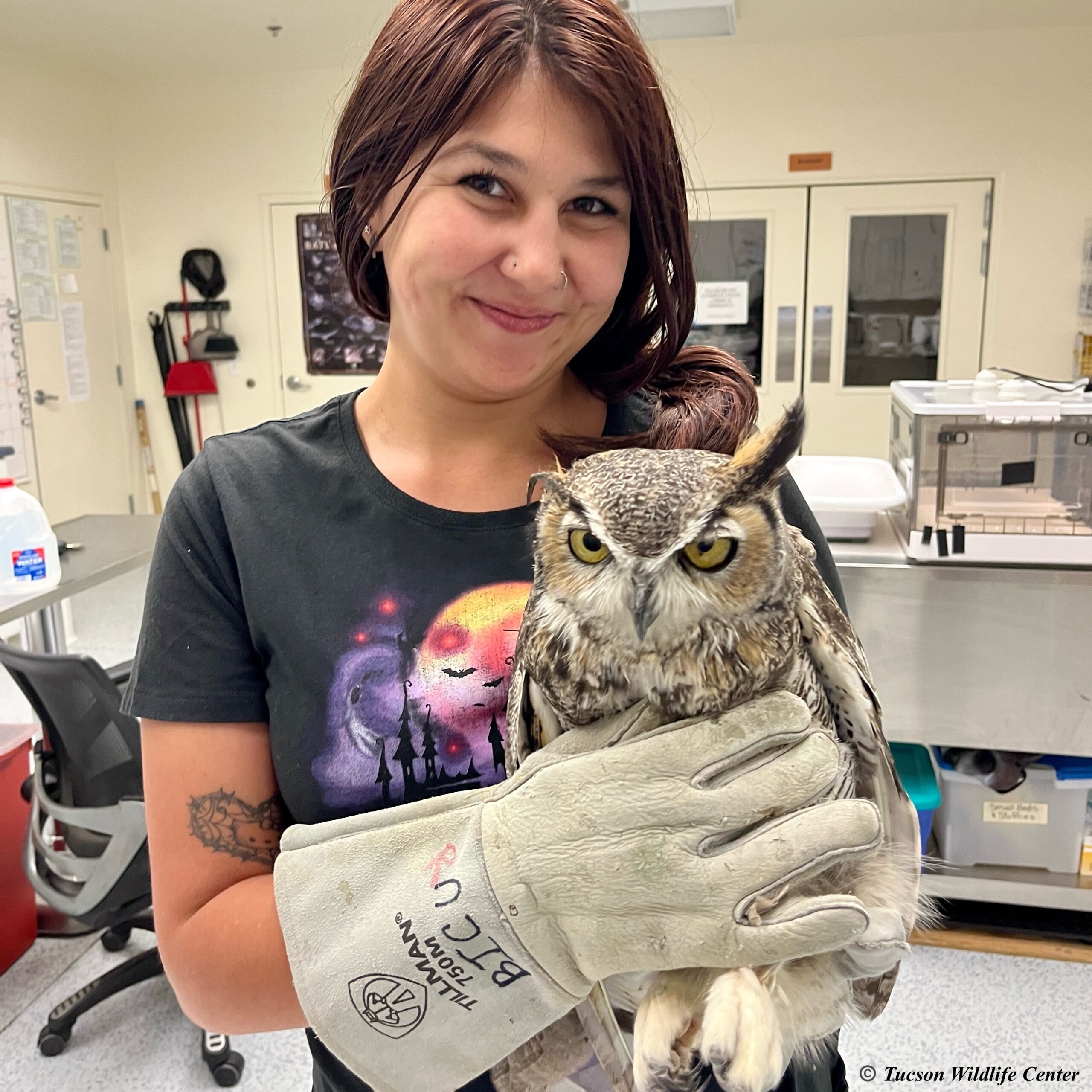 Tucson Wildlife Center’s rescue team recently responded to three separate Great Horned Owl rescues. In each case, the owl was found near a roadway after an apparent collision with a moving vehicle. All three birds suffered a combination of head and eye trauma, and varying degrees of fractures from the impact.