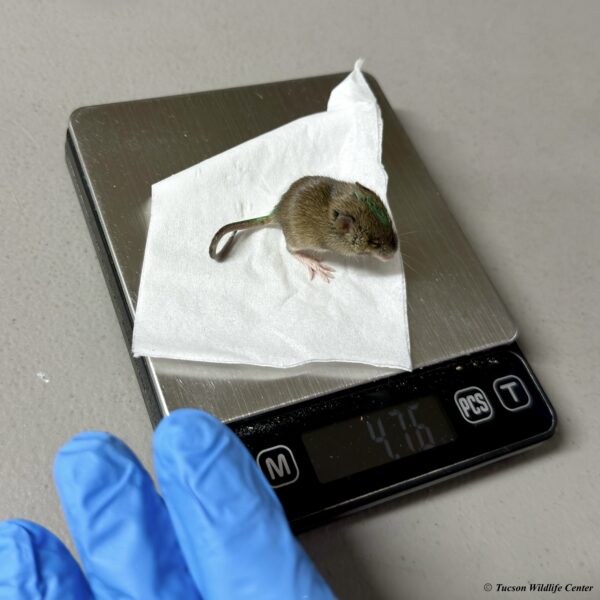 Four newborn mice were recently brought to Tucson Wildlife Center after being found orphaned. Arizona is home to many different mouse species, and they all develop quickly in their first weeks of life. These little ones—estimated at just about a week old—still have their eyes closed but they already have a soft coat of fur, an early milestone in a mouse’s rapid growth.