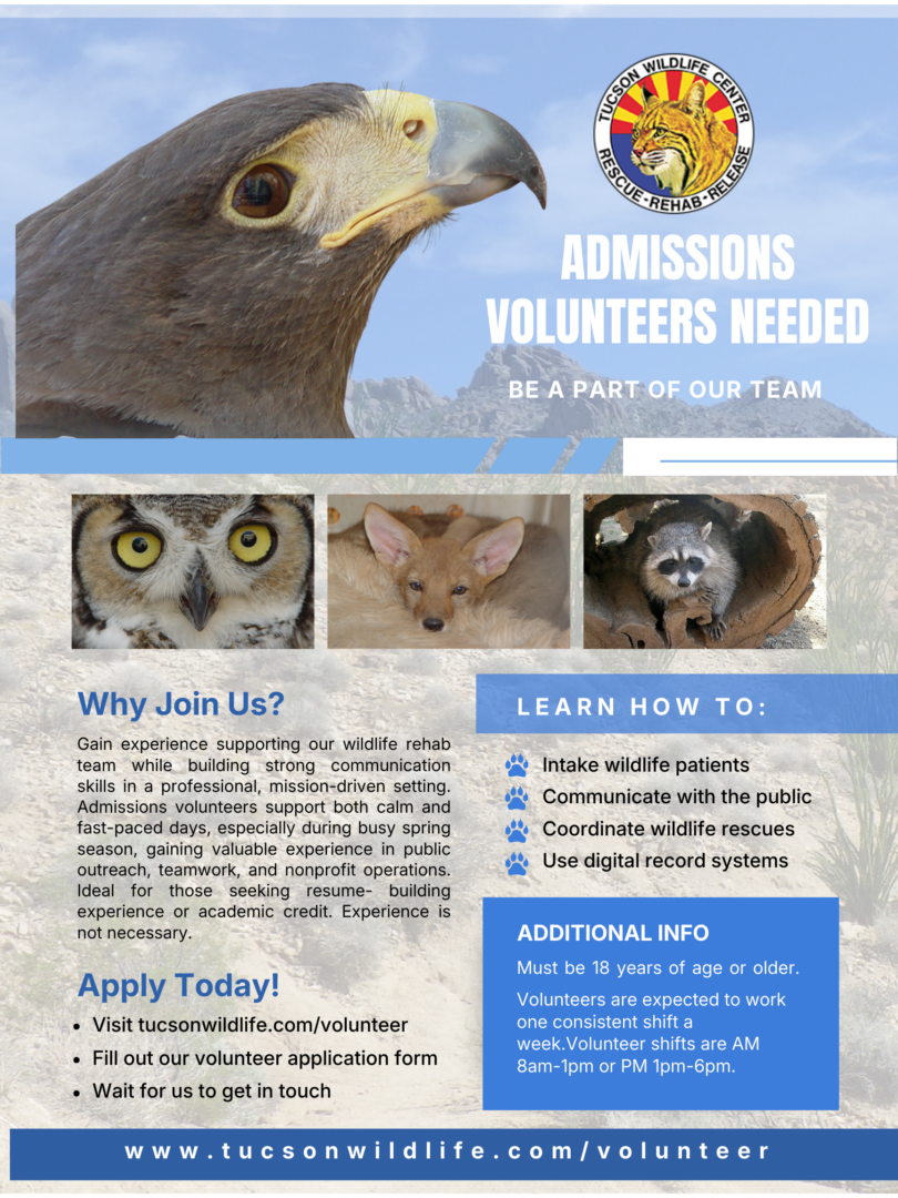 Experience is not necessary, and training will be provided. Multitasking is a plus, as well as a general knowledge of native Arizona wildlife, but not required. Good customer service skills and ability to interact with the public in a professional manner is required. Some light clerical work (data entry) may also be expected.